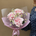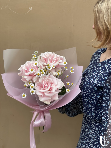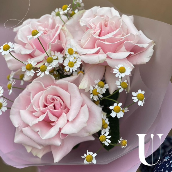 Этот изящный букет сочетает в себе нежность и очарование розовых французских роз и простоту ромашек (Матрикарий). Розы, с их бархатистыми лепестками и утонченным ароматом, придают композиции романтическое настроение, а их мягкий розовый цвет символизирует любовь и нежность. В окружении этих великолепных цветов яркие белоснежные ромашки добавляют свежести и легкости, создавая атмосферу весеннего утра.