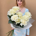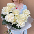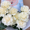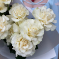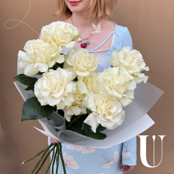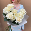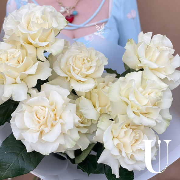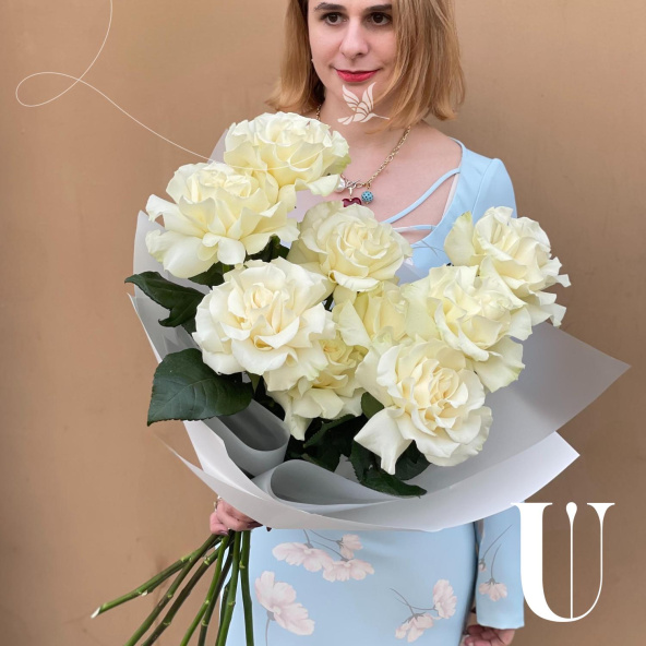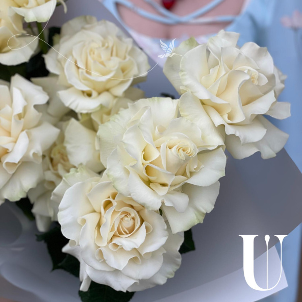 Этот изысканный букет состоит из девяти белых кружевных французских роз, каждая из которых излучает нежность и элегантность. Лепестки этих роз, словно покрытые тонким кружевом, переливаются на свету, создавая эффект волшебства и романтики.