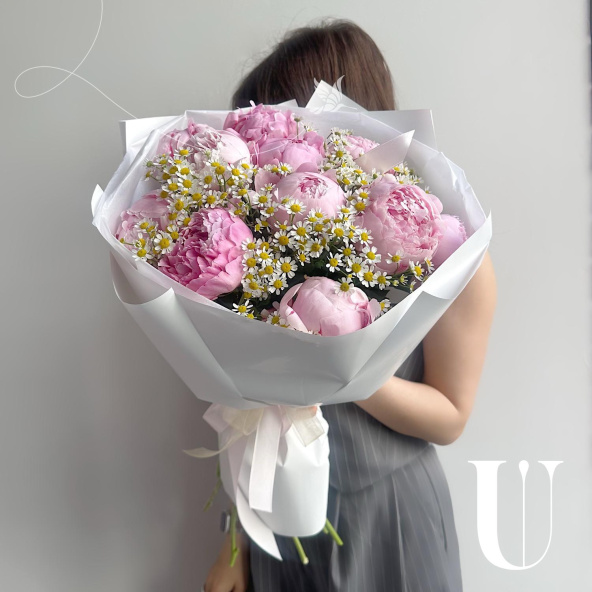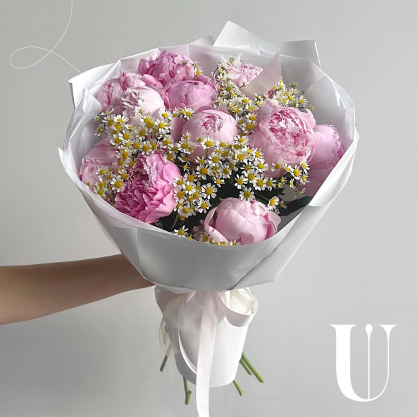 Монобукет из розовых и белых пионовидных роз в дизайнерской упаковке