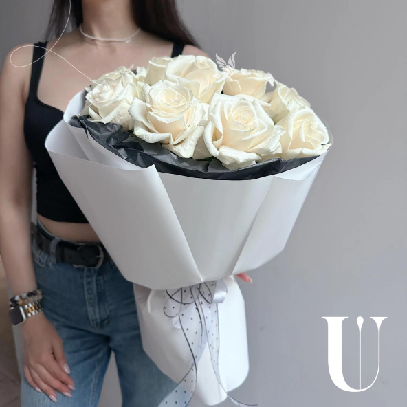 Букет из 7 белых роз сорта Мондиаль с атласной лентой