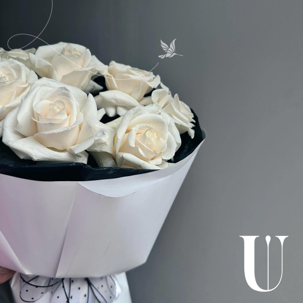 Букет из 9 роз Вайт Охара в фиолетовой упаковке