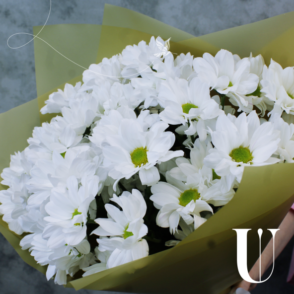 Букет из 5 белых кустовых ромашковых хризантем в матовой пленке с атласной лентой — это отличный выбор для тех, кто хочет подарить радость и тепло близким людям.