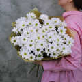 Букет из 9 белых кустовых ромашковых хризантем в матовой пленке с атласной лентой — это отличный выбор для тех, кто хочет подарить радость и тепло близким людям.