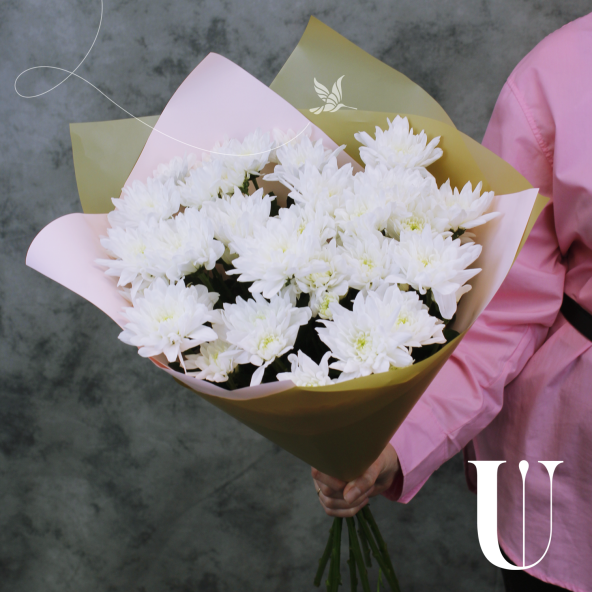 Классический букет из 7 белых кустовых хризантем в матовой пленке с атласной лентой — это отличный выбор для тех, кто хочет подарить радость и тепло близким людям.