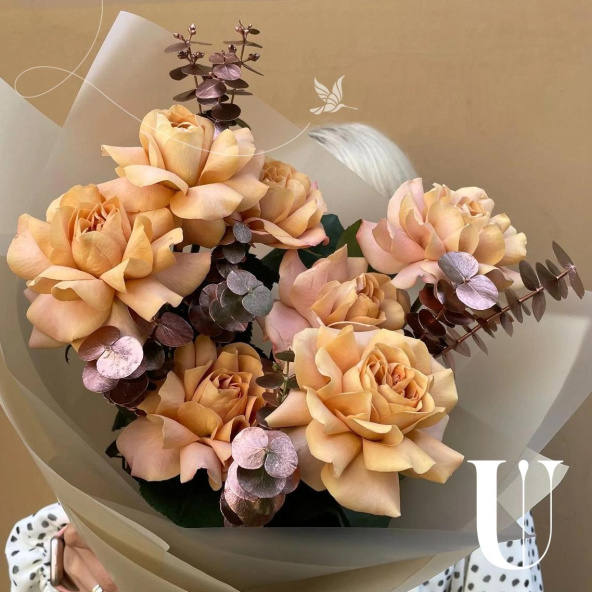 Дополняет букет окрашенный эвкалипт бронзового цвета, который добавляет нотки тепла и оригинальности. Его тонкие листья создают легкий контраст и придают композиции особую глубину.