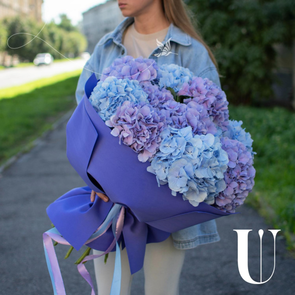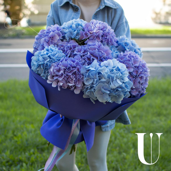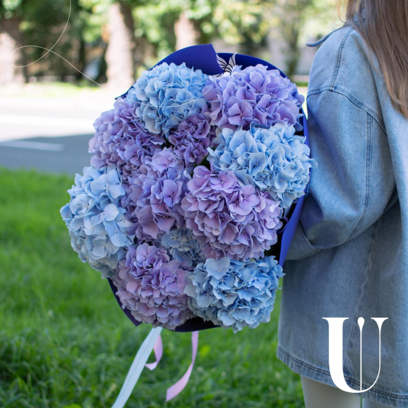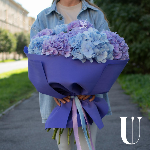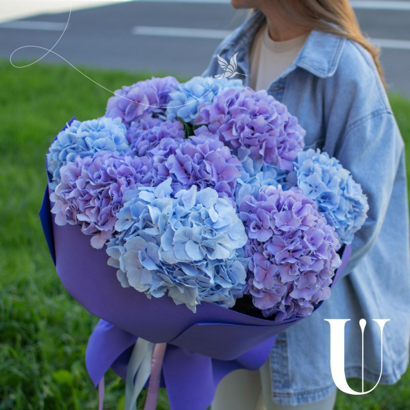 Роскошный букет из гортензии в синих и фиолетовых тонах.