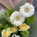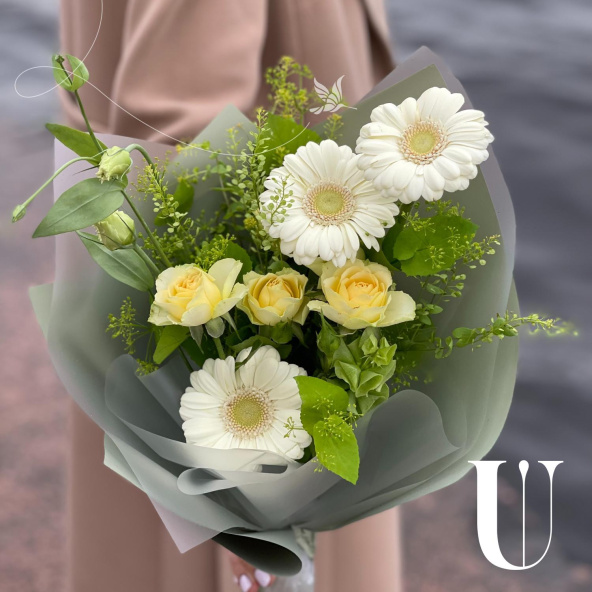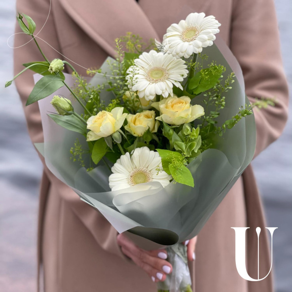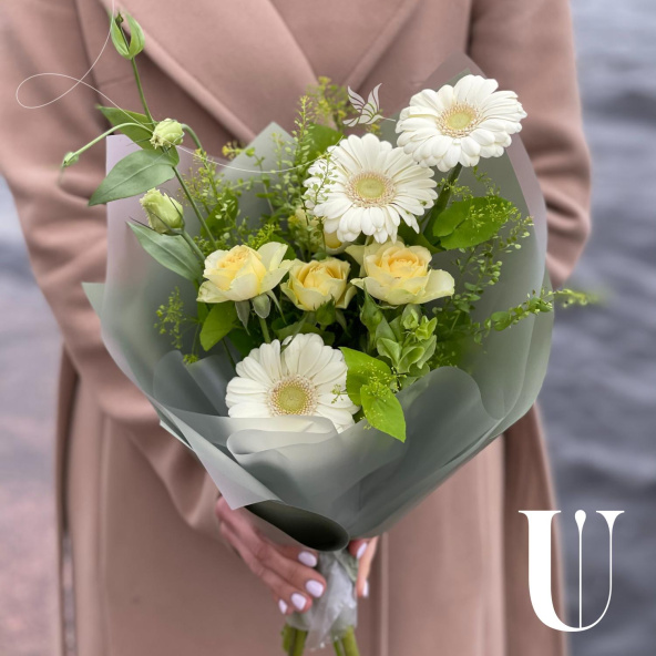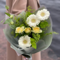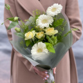 Монобукет из 7 розовых диантусов и эвкалипта в упаковке