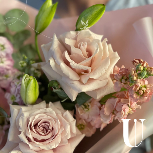 Монобукет из 7 роз сорта Капучино и эвкалипта в дизайнерской упаковке
