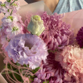 Монобукет из пионовидных роз Кахала и лимониума в нежной упаковке