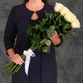 Монобукет из пионовидных роз сорта Шиммер в стильной упаковке