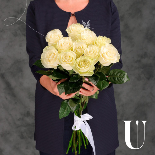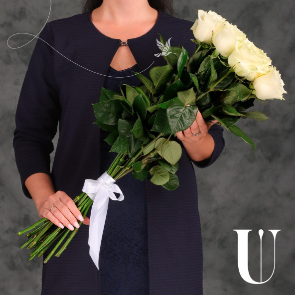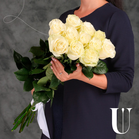 Букет из 11 розовых роз сорта Эксплорер с атласной лентой