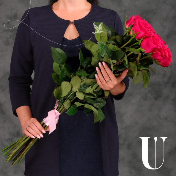 Монобукет из роз сорта Мондиаль 70 см с атласной лентой