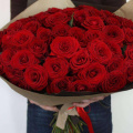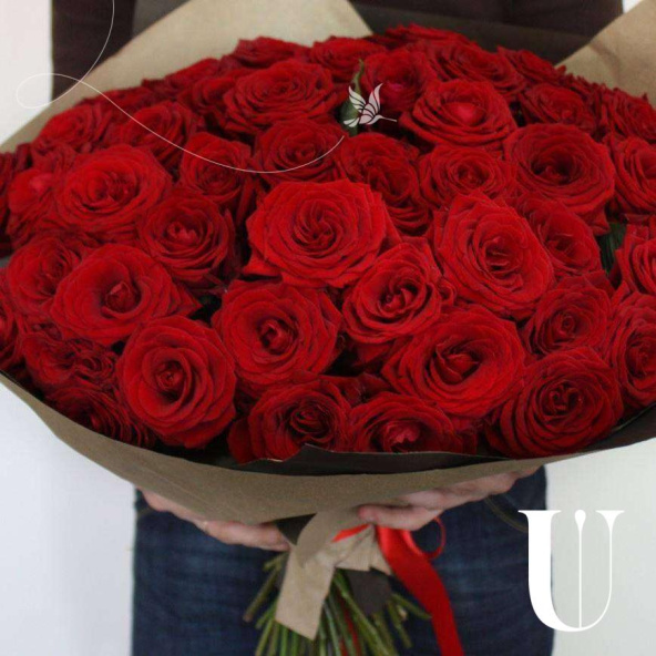 - Эффектный классический букет из 75 свежих алых роз длиной 50 см.Вид роз может незначительно отличаться от фото на сайте в зависимости от сезона
