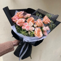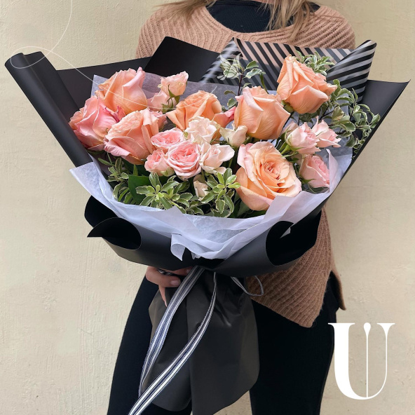 Монобукет из розовых кустовых пионовидных роз в дизайнерской упаковке
