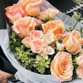 Монобукет из пионовидных роз сорта Шиммер в стильной упаковке