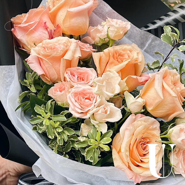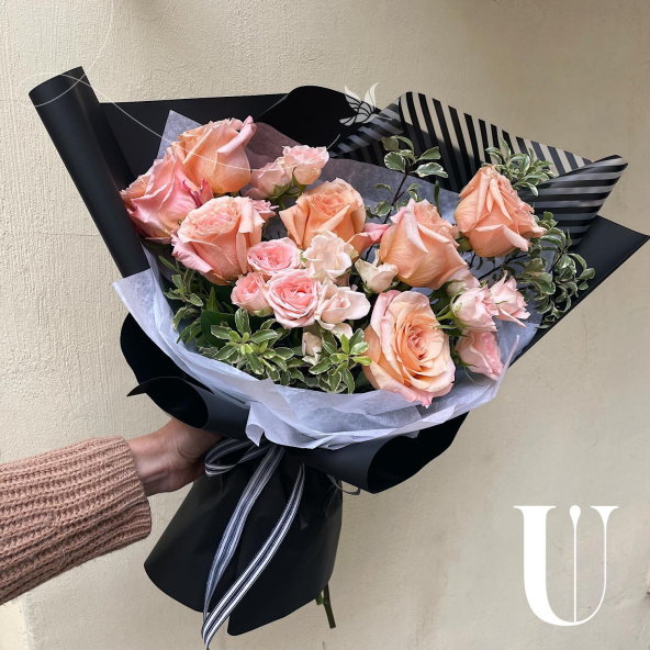 Монобукет из 9 роз сорта Кендаллайт в дизайнерской упаковке