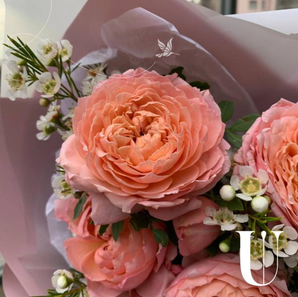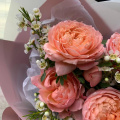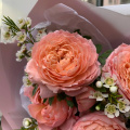 Сочный букет с французскими розами и красными альстромериями в упаковке