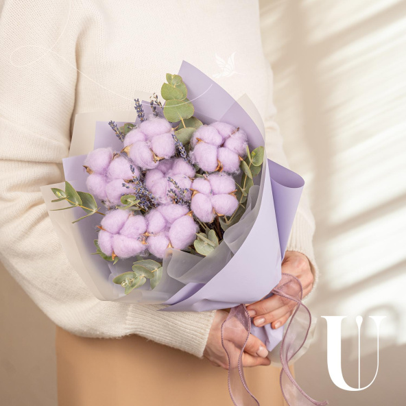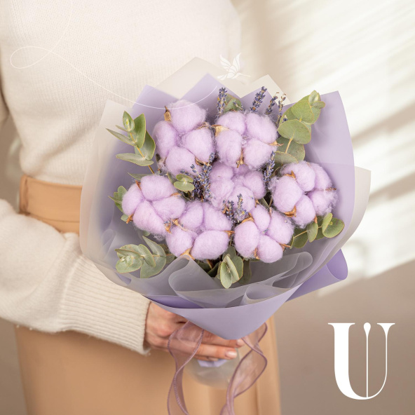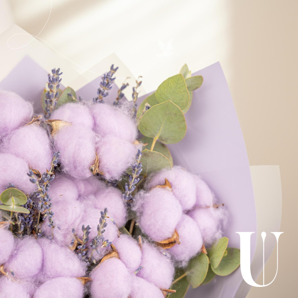 Мини-букет из розового хлопка и эвкалипта в упаковке