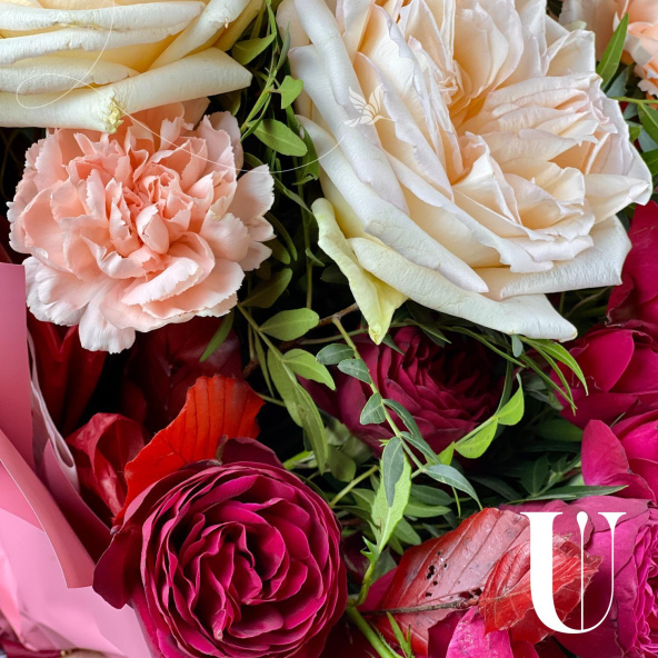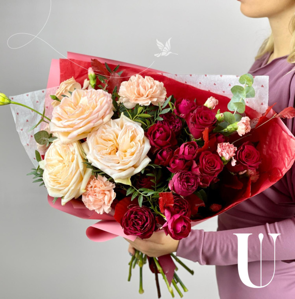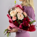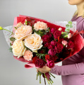 Букет из кустовых пионовидных роз сорта Джульетта в дизайнерской упаковке