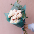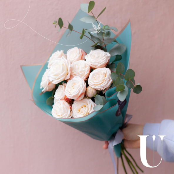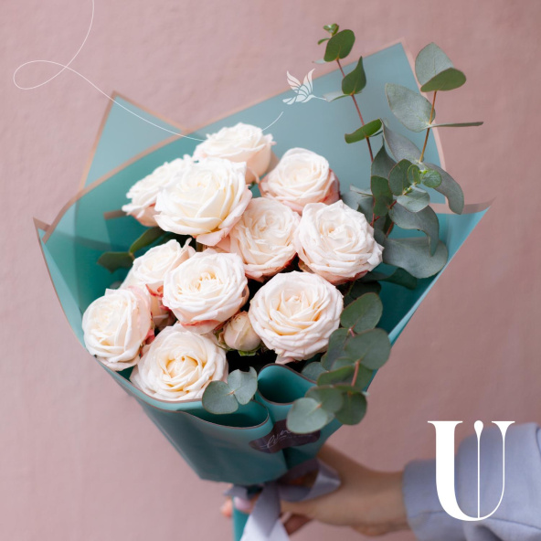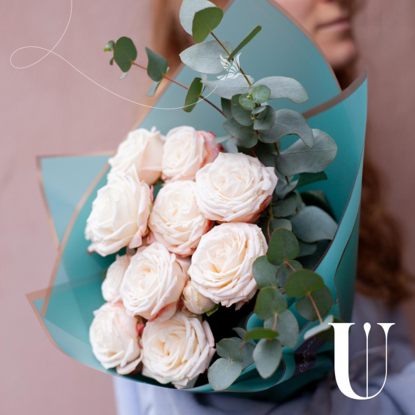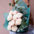 Монобукет из 7 роз сорта Капучино и эвкалипта в дизайнерской упаковке
