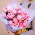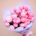 Монобукет из кустовых пионовидных роз сорта Бомбастик в дизайнерской упаковке
