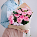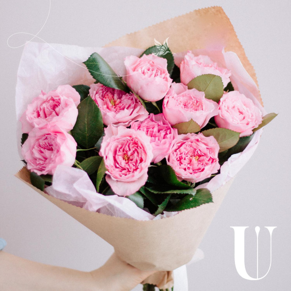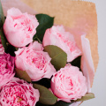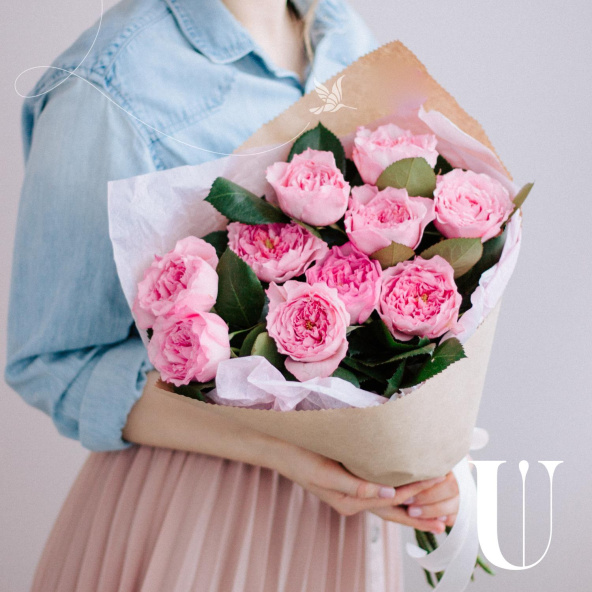 Стильный букет из пионвидных розовых роз в дизайнерской упаковке