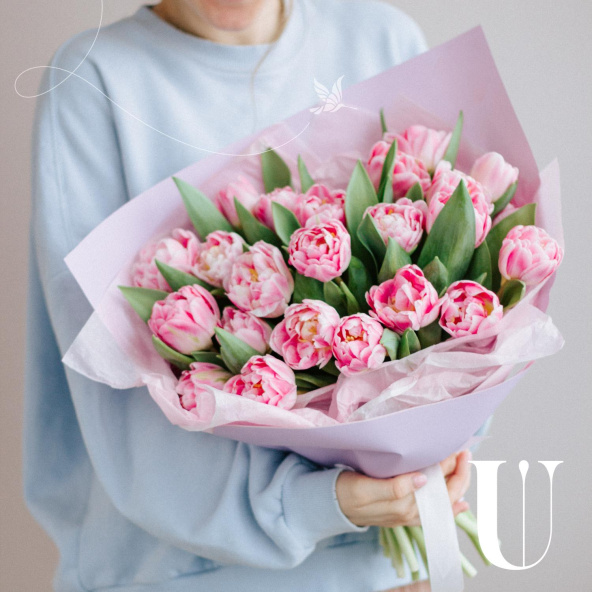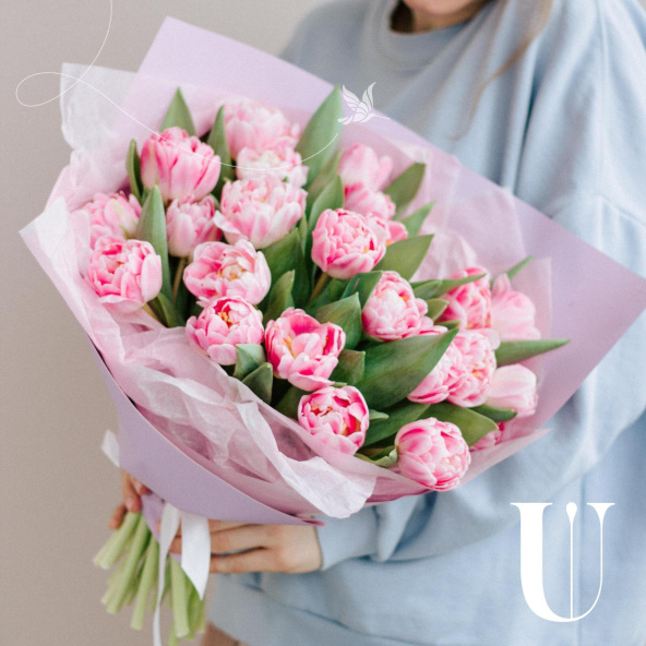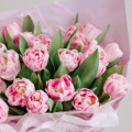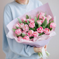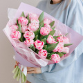 Стильный букет из пионвидных розовых роз в дизайнерской упаковке