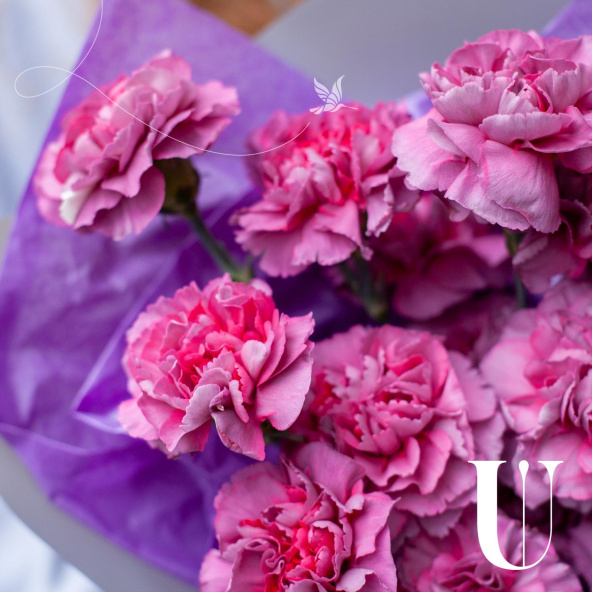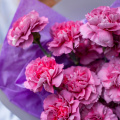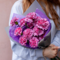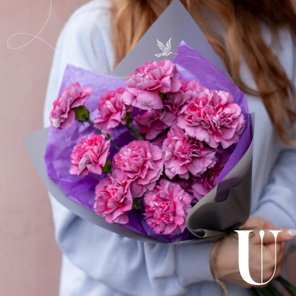 Монобукет из 7 розовых диантусов и эвкалипта в упаковке