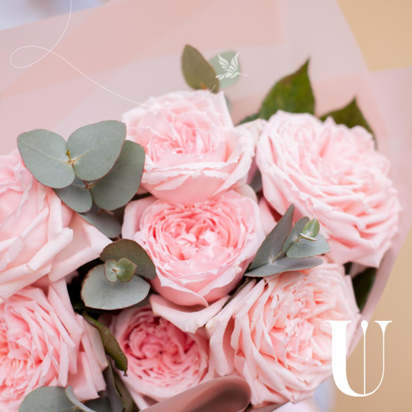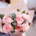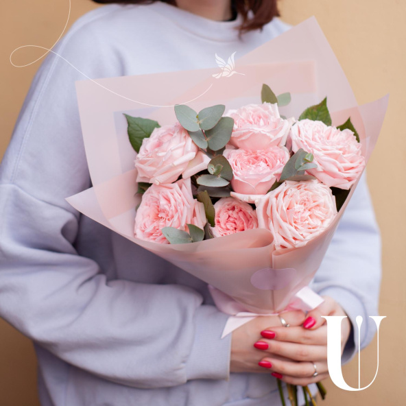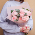 Букет из кустовых пионовидных роз сорта Джульетта в дизайнерской упаковке