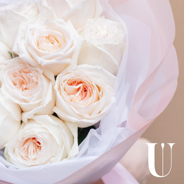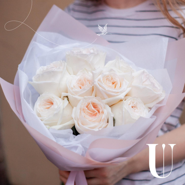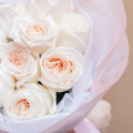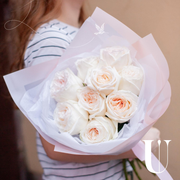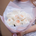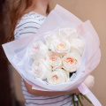 Монобукет из пионовидных роз сорта Шиммер в стильной упаковке