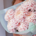 Букет из белых кустовых хризантем и розовых диантусов в упаковке