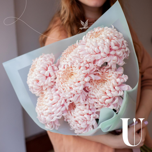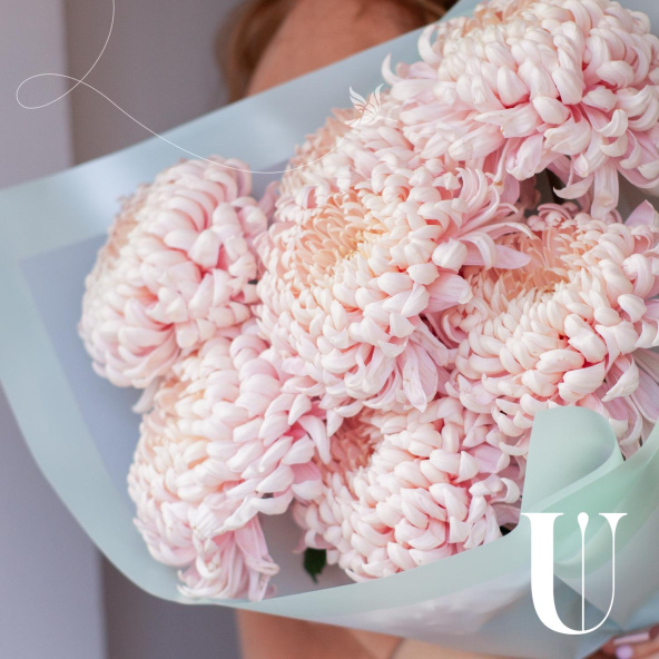 Монобукет из 5 белых хризантем сорта Виена в белой упаковке