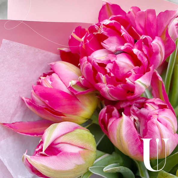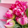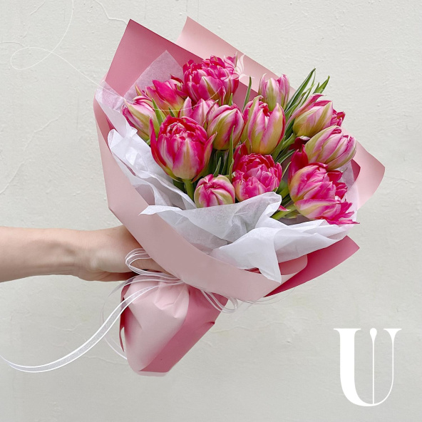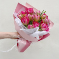 Монобукет из кустовых пионовидных роз сорта Бомбастик в дизайнерской упаковке