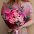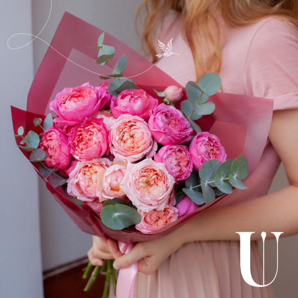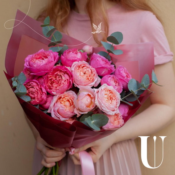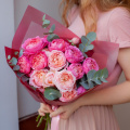 Нежная композиция из пионовидных роз в дизайнерской упаковке
