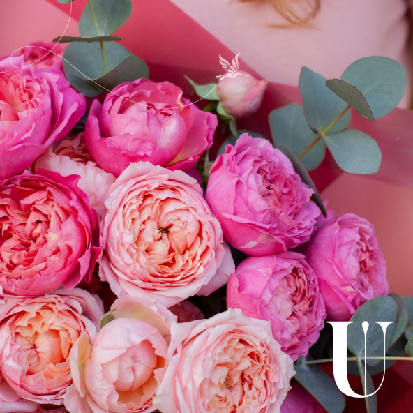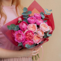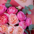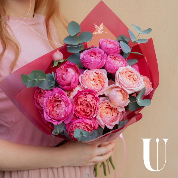 Букет из кустовых пионовидных роз сорта Джульетта в дизайнерской упаковке