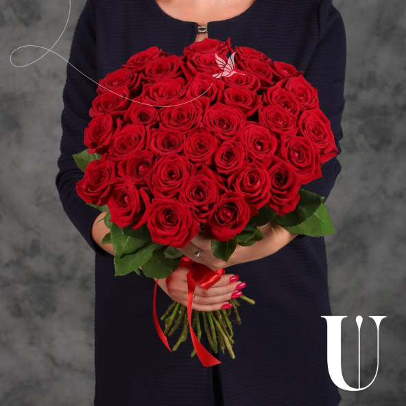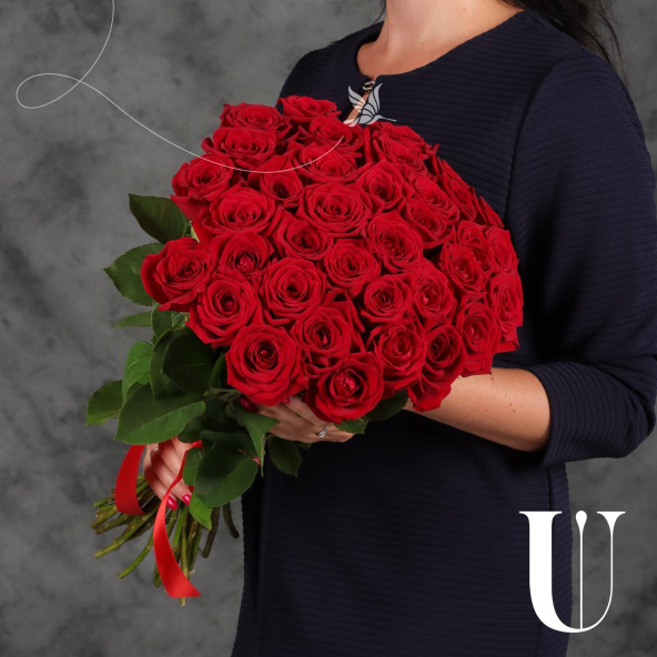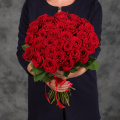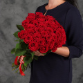 Монобукет из роз сорта Мондиаль 70 см с атласной лентой