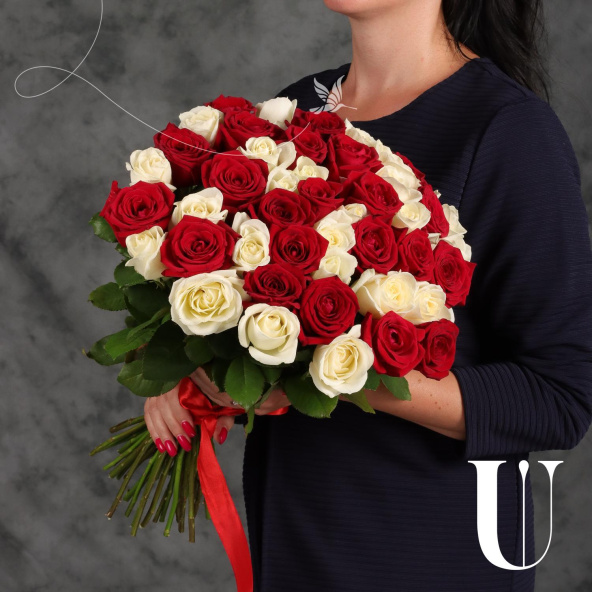 Монобукет из 15 роз сорта Пинк Флойд с атласной лентой