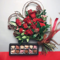 - В составе букета красные розы разных сортов, скимия, брунея и гиперикум