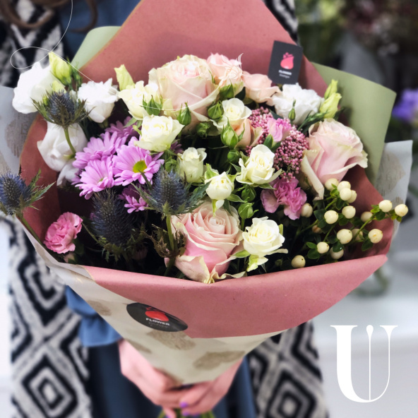 - Эрингиума и гвоздики. Оформлено стильной упаковкой