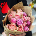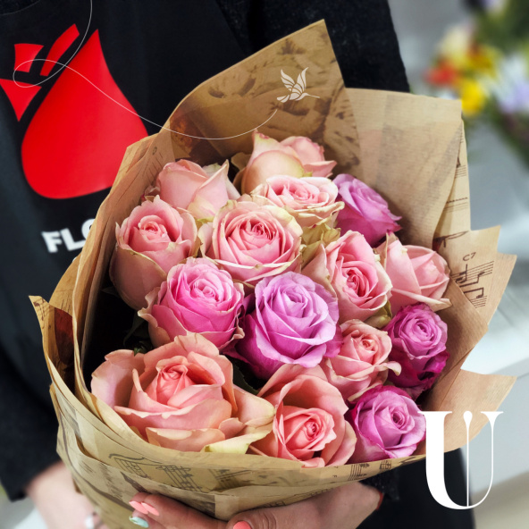 Монобукет из 15 роз в нежно розовых тонах. В крафтовой упаковке