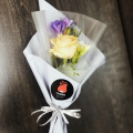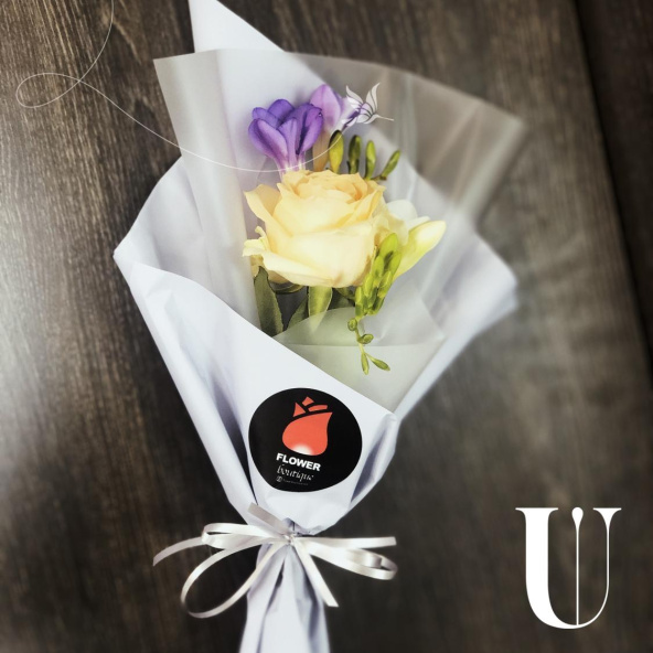 Букет-комплимент из розы, фрезии и зелени в оригинальной упаковке.