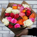 - Букет из 25 разного цвета роз в крафтовой бумаге. В состав входят: розовые
