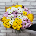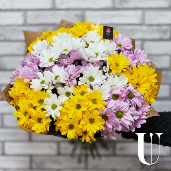 Букет микс из кустовой хризантемы (5желтая, 5розовая, 5белая). Оформлено в крафтовую упаковку