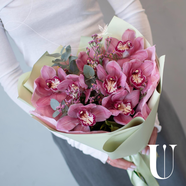 Яркий букет из орхидей, лимониума и зелени.