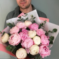 Букет из 15 нежно розовых и сливочных пионов, с веточками эвкалипта, в стильной упаковке