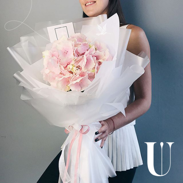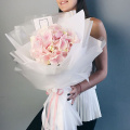 Монобукет из 5 роз сорта Вайт Охара и лимониума в упаковке