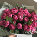 Букет кустовых пионовидных роз, с веточками ароматного эвкалипта, в стильной упаковке