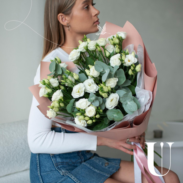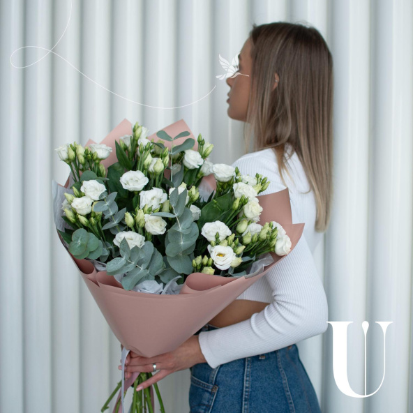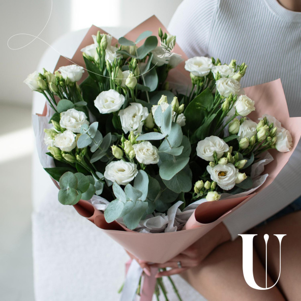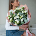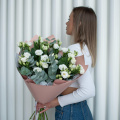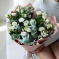 Монобукет из розовых и белых пионовидных роз в дизайнерской упаковке