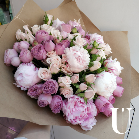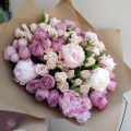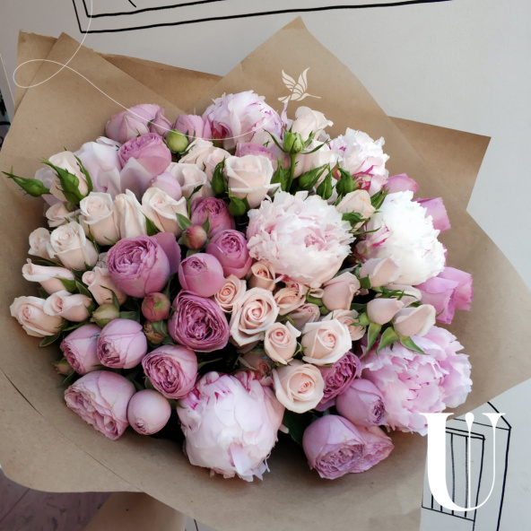 Монобукет из нежно-розовых кустовых пионовидных роз в белой упаковке