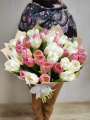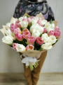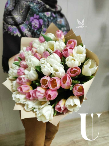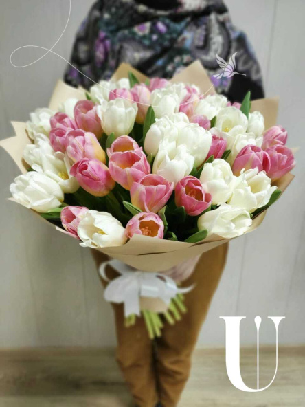 Состав: Тюльпаны микс (51 шт.), рускус изр., упаковка.